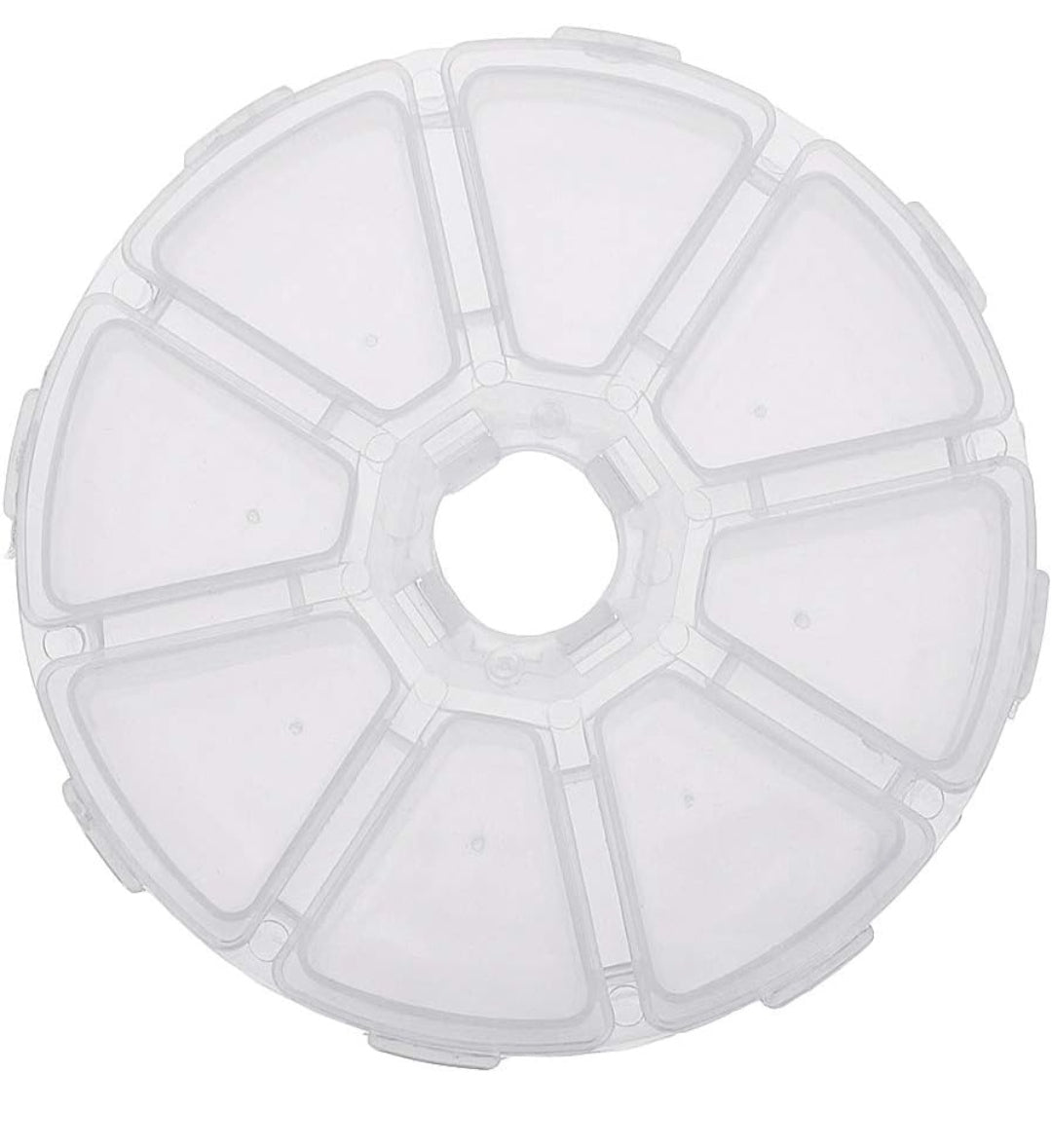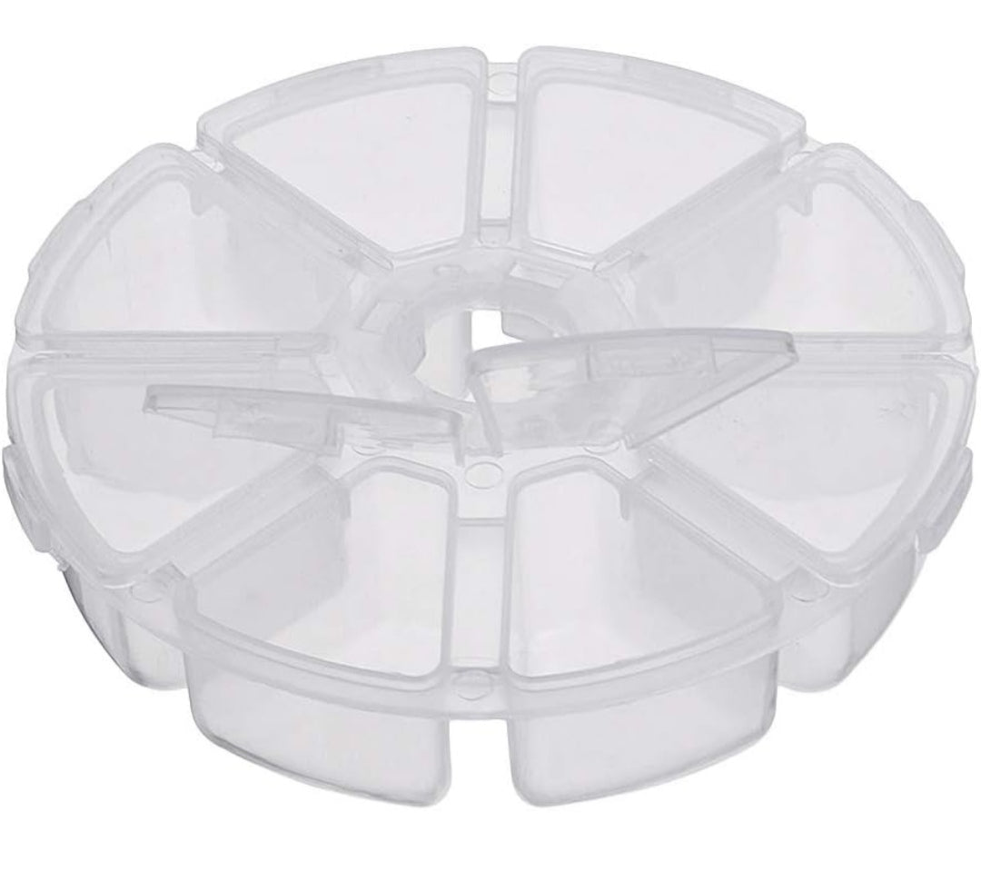 Cajita plástica redonda de 8 compartimientos ideal para almacenar diamantes u otros accesorios.